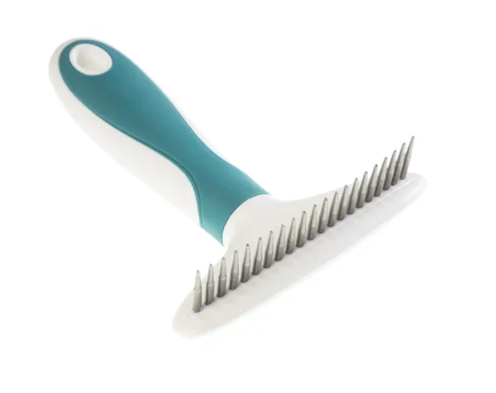 Gimdog Dematting Rake (12 x 15 cm) – tai specialus grėblys, sukurtas ilgesniam šunų ir kačių kailiui prižiūrėti. Stambūs konusiniai dantys efektyviai pašalina susivėlusius, įsivėlusius ir negyvus plaukus. Jie lengvai prasiskverbia per tankų kailio sluoksnį, atsargiai atlaisvindami susivėlusias vietas ir nepažeisdami odos. Grėblys padeda palaikyti sveiką, minkštą ir tvarkingą kailį net labai tankiems ar garbanotiems plaukams.