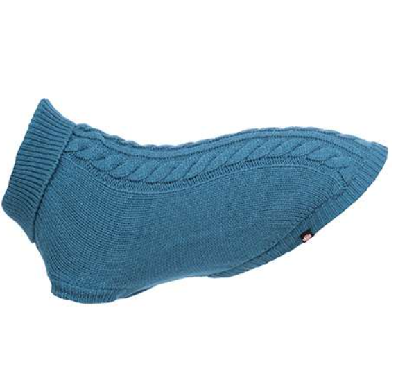 TRIXIE Kenton megztinis, XS dydis (nugaros ilgis – 30 cm), mėlynos spalvos – tai patogus ir stilingas pasirinkimas mažiems šunims, kuriems reikia papildomos šilumos ir komforto vėsesniu oru. Megztinis pagamintas iš sintetinės vilnos (akrilas), kuri yra švelni, minkšta ir maloni liesti, todėl jūsų augintinis jausis jaukiai ir šiltai visą dieną. Sintetinė vilna puikiai išlaiko formą net po daugelio skalbimų, nesusivelia ir nesitraukia, todėl megztinis ilgai išlaiko savo išvaizdą.