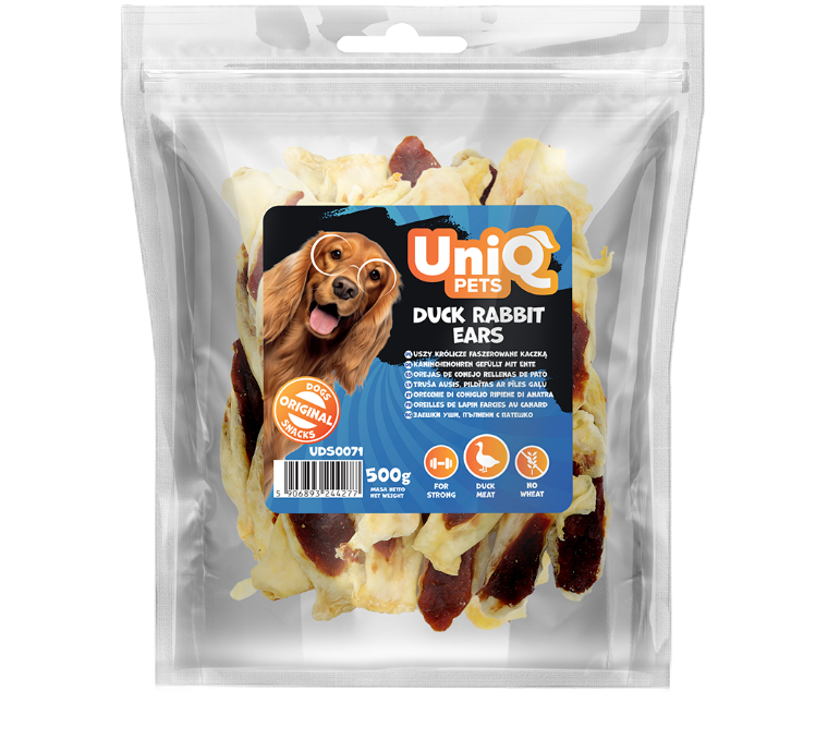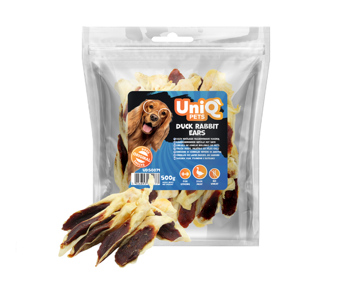 Uniq Pets Duck & Rabbit Ears 500 g – džiovintos triušio ausys su antienos mėsa