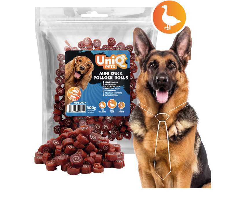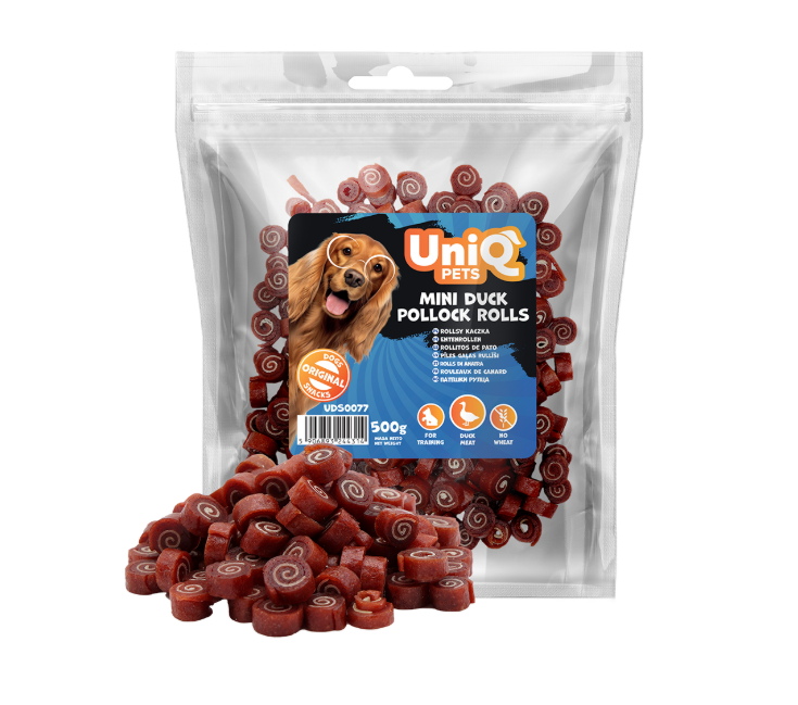 UNIQ PETS Mini Duck & Pollock Rolls 500 g – skanėstai šunims su antiena ir menke